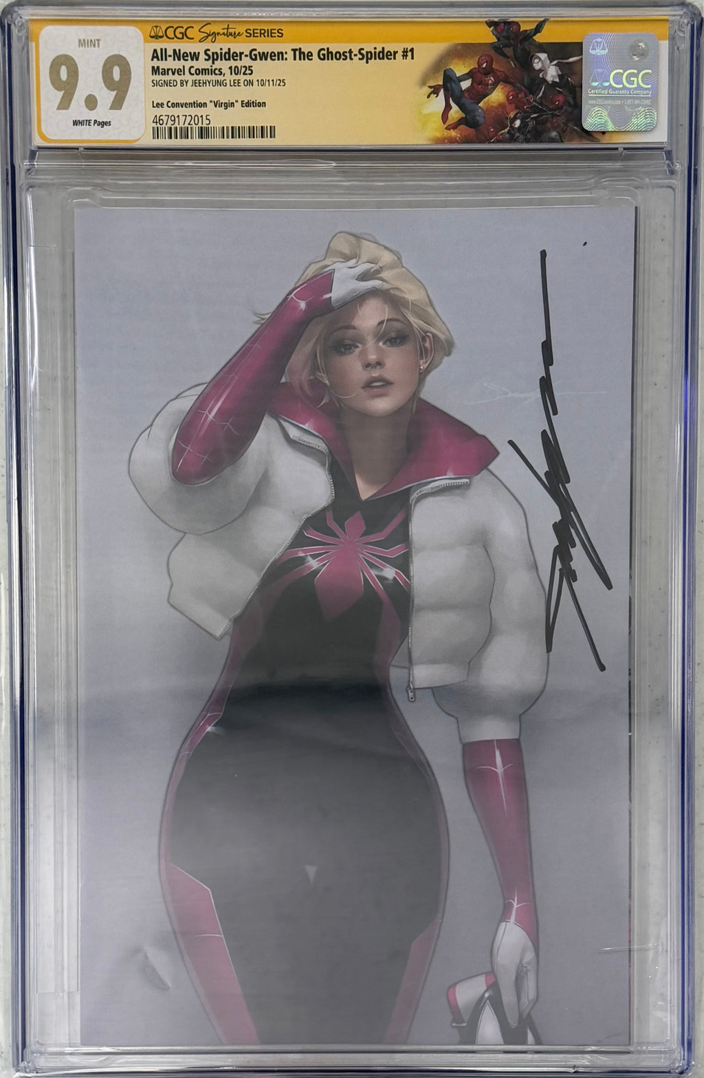 ALL-NEW SPIDER-GWEN: THE GHOST-SPIDER #1 EXCLUSIVE VIRGIN EDITION SIGNED BY JEEHYUNG LEE W/SPIDERVERSE CUSTOM LABEL CGC 9.9 MINT